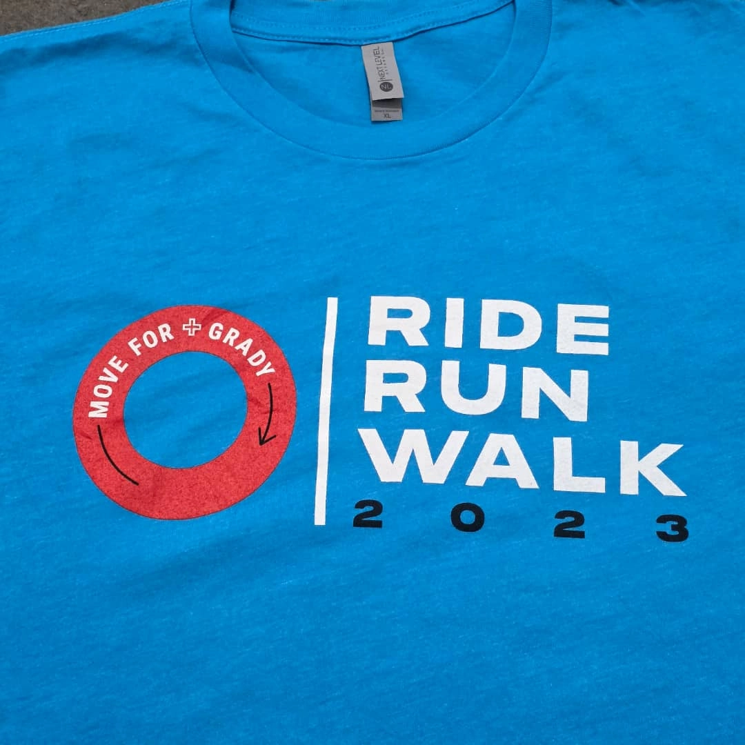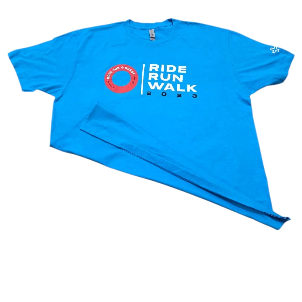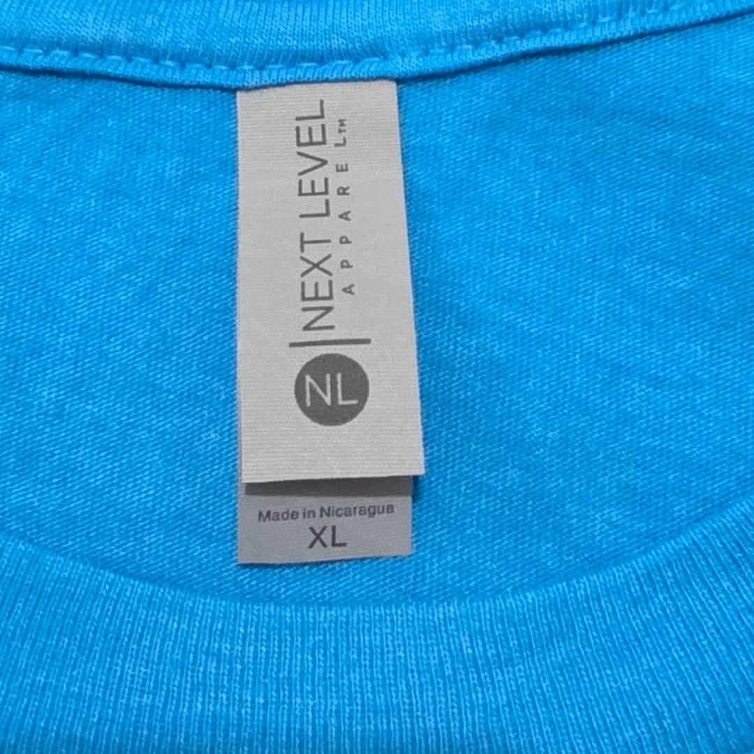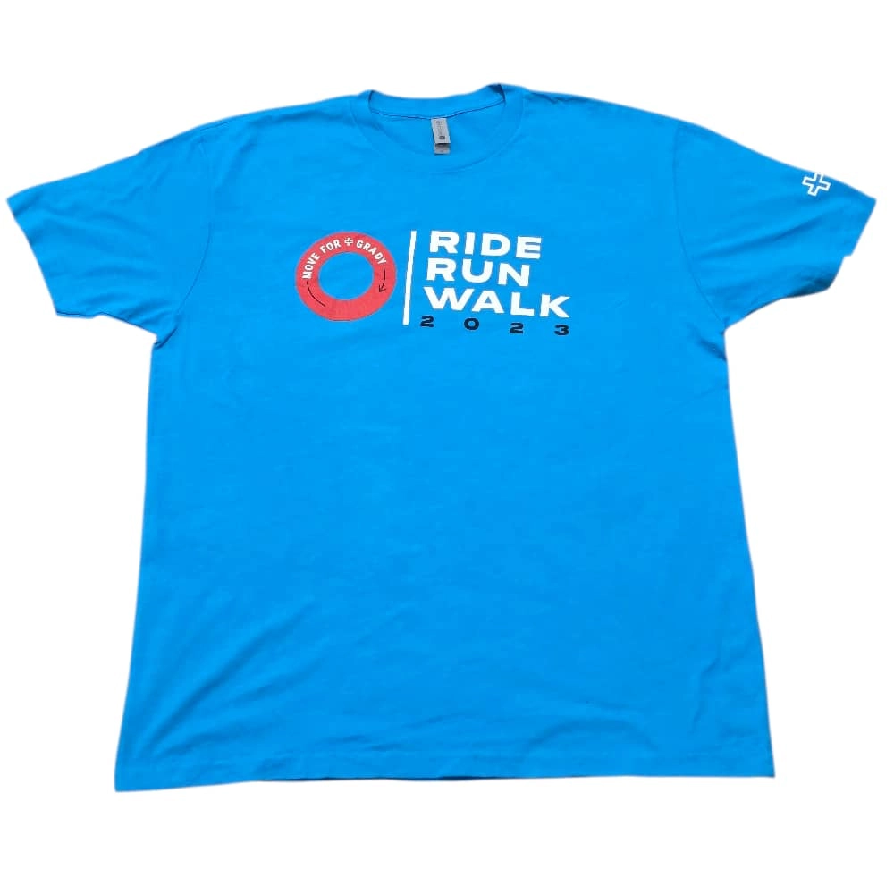 تیشرت آبی با برند NEXT LEVEL APPAREL (ساخت نیکاراگوئه) و چاپ شده با طرح “RIDE RUN WALK 2023”