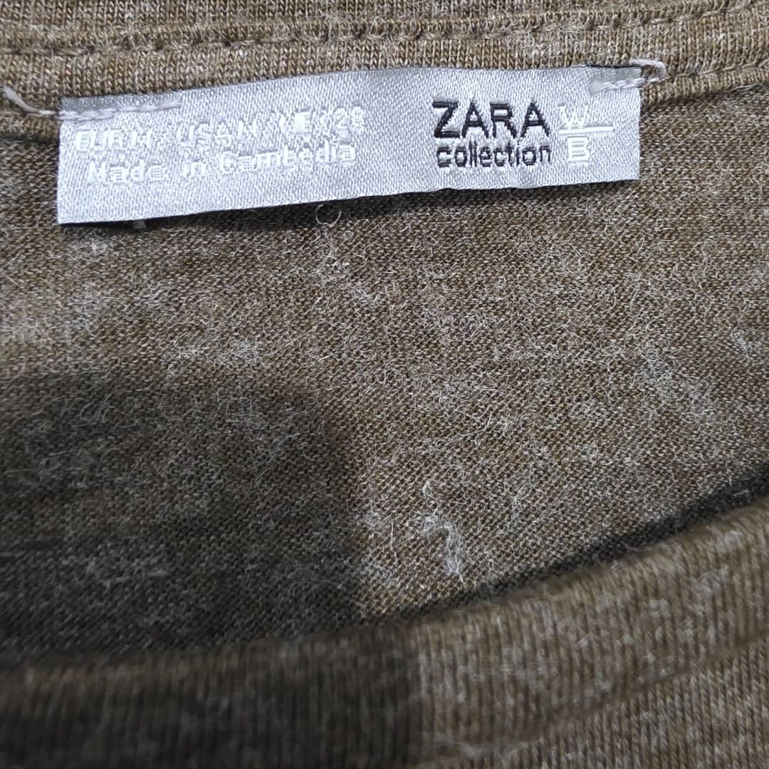 این تیشرت زنانه از برند ZARA Collection B است که در کشور کامبوج تولید شده. جنس پارچه آن نازک و سبک به نظر میرسد و طراحی خاصی دارد: