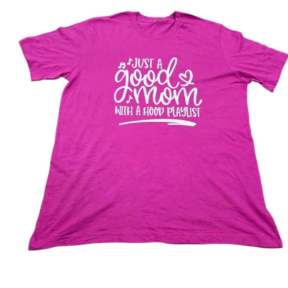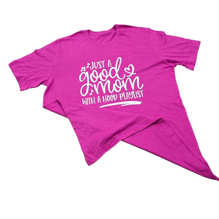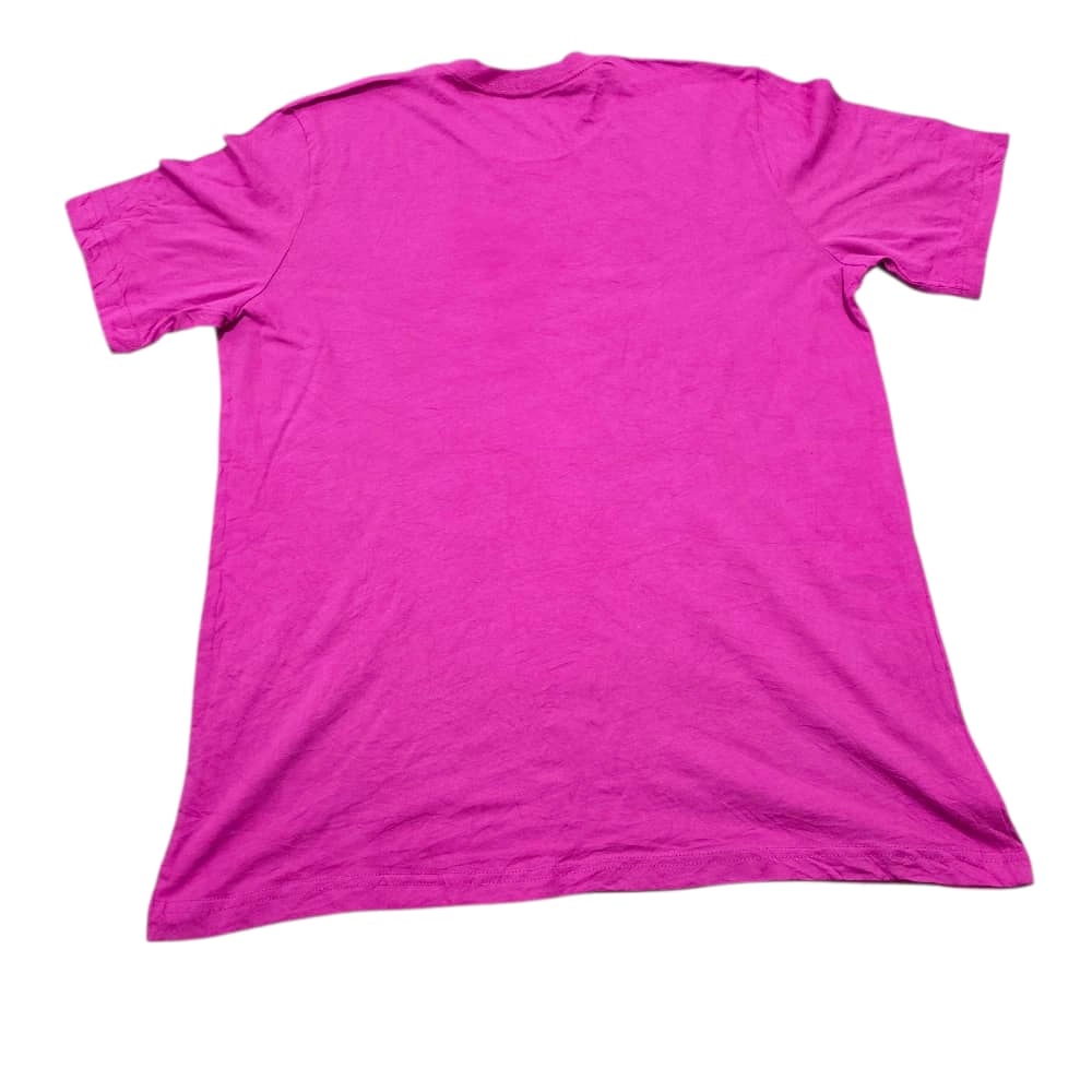 این تصویری از یک تیشرت صورتی رنگ (تقریباً سرخابی) است که روی آن نوشتهای با فونت سفید و فانتزی چاپ شده است. تیشرت آستین کوتاه و یقه گرد دارد و روی یک سطح سفید قرار گرفته است.
