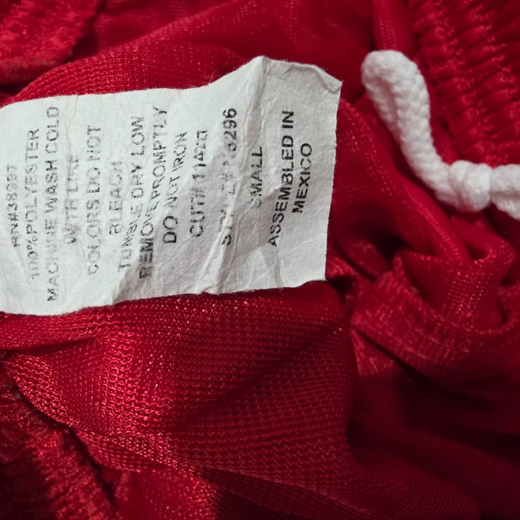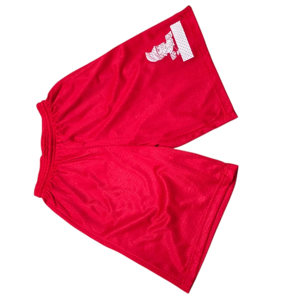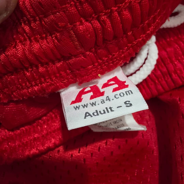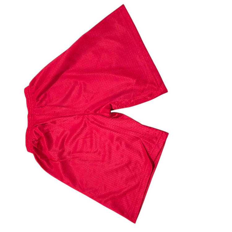 شورت ورزشی قرمز رنگ این شورت از جنس مشبک (mesh) است که برای لباسهای ورزشی بسیار رایج است و به تهویه هوا کمک میکند. در قسمت بالای سمت راست شورت، یک لوگوی سفیدرنگ دیده میشود مربوط به تیم NC State باشد،