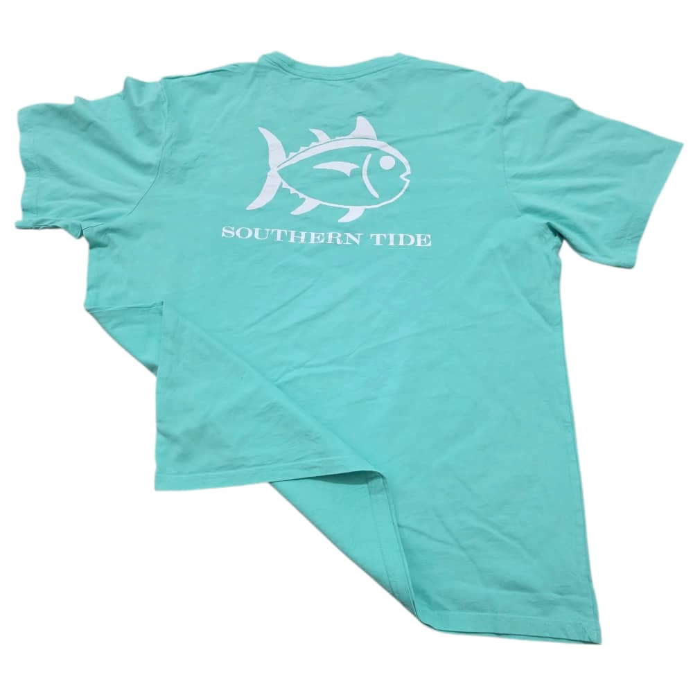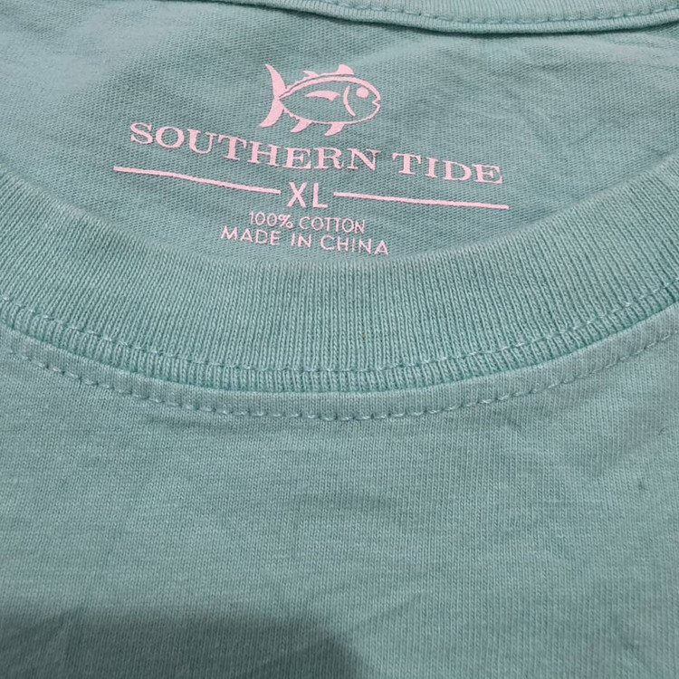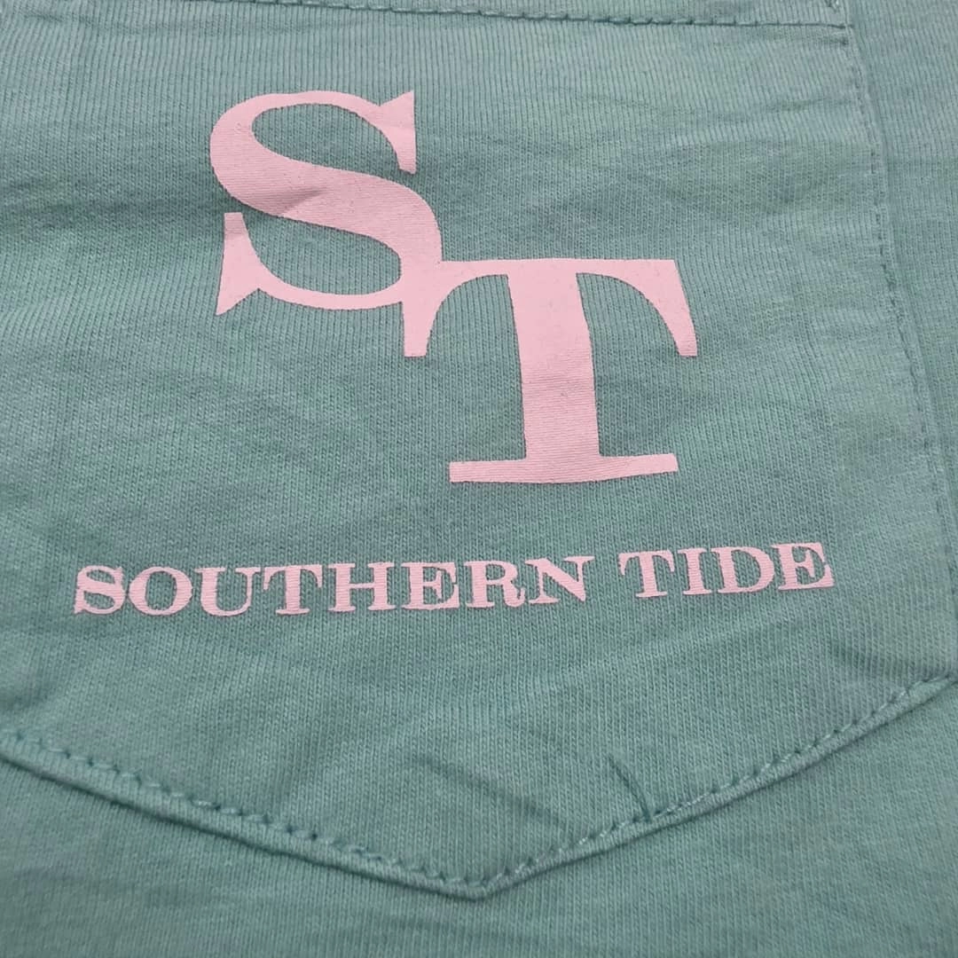* طرح پشت: در قسمت پشت تیشرت، یک لوگوی بزرگ سفید رنگ از یک ماهی و زیر آن کلمه "SOUTHERN TIDE" نوشته شده است.