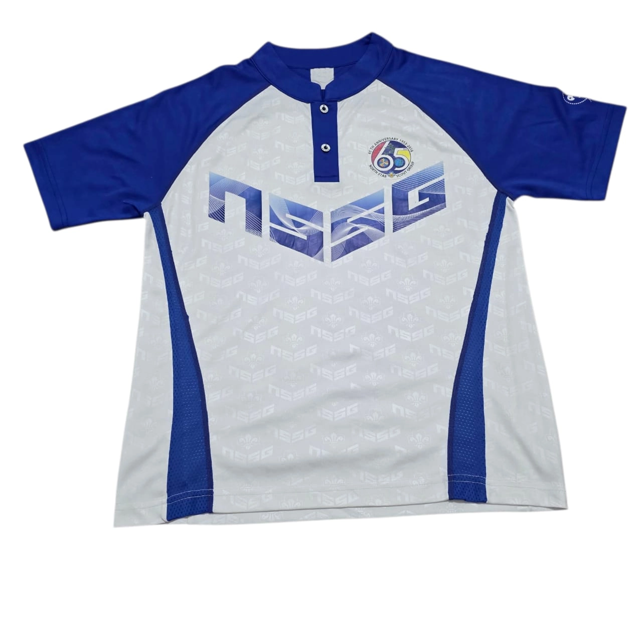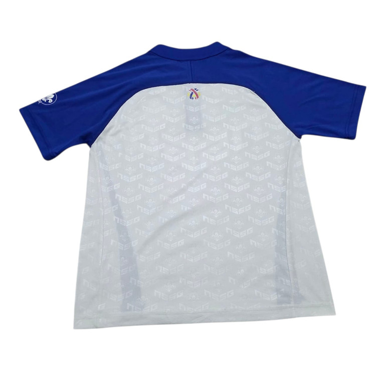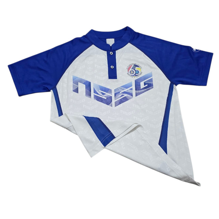 رنگ اصلی تیشرت سفید است با آستینها و قسمتهایی در کنارهها به رنگ آبی. در قسمت جلوی تیشرت، یک لوگوی بزرگ شامل حروف "NESG" به صورت سهبعدی و با طرحی مدرن دیده میشود.