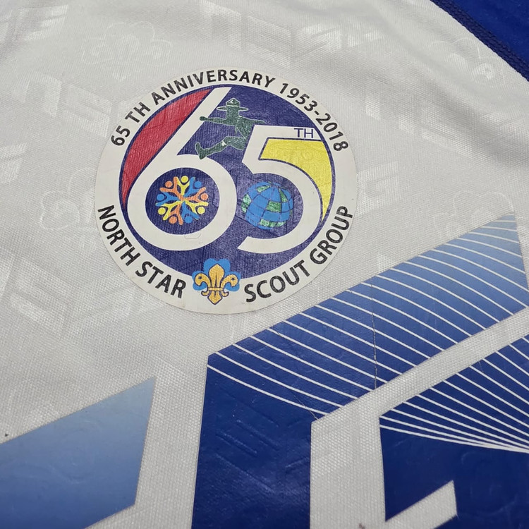 یقه تیشرت دکمهدار است. طرحهای محو و تکراری از لوگوهای کوچکتر نیز در سراسر قسمت سفید رنگ تیشرت به چشم میخورند. این تیشرت میتواند برای ورزشهایی مانند کریکت، بیسبال یا سایر فعالیتهای تیمی مناسب باشد.