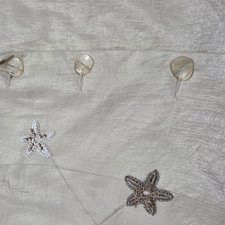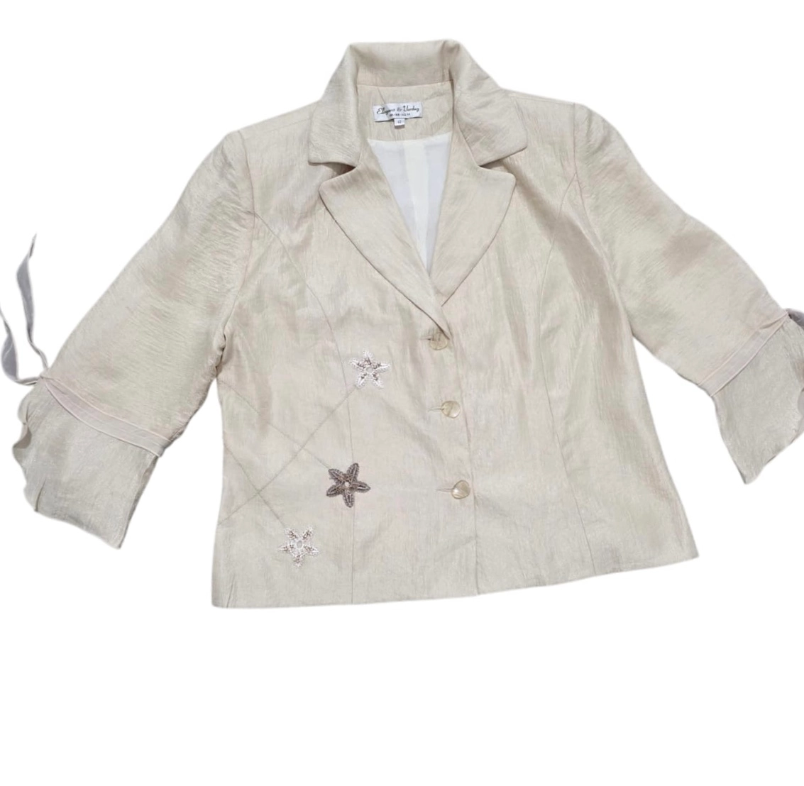 این یک کت مجلسی زنانه به رنگ بژ یا کرم روشن است. یقهی آن به صورت برگردان طراحی شده و سه دکمه برای بستن در جلوی کت قرار گرفته است. ویژگی خاص این کت، تزیینات ستارهای شکل براق است که با نخدوزی و احتمالا پولک یا منجوق در قسمت جلویی آن کار شده است. خطوط دوخته شدهای نیز به صورت مورب در قسمت میانی کت دیده میشود که به جذابیت طرح میافزاید. آستینهای کت سه ربع و دارای جزئیات پاگون مانند یا دوختهای تزئینی در قسمت پایینتر هستند. این کت برای مناسبتهای نیمهرسمی و مجلسی مناسب است و به دلیل رنگ خنثی، به راحتی با لباسهای دیگر ست میشود.