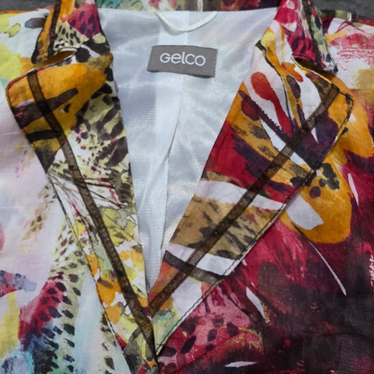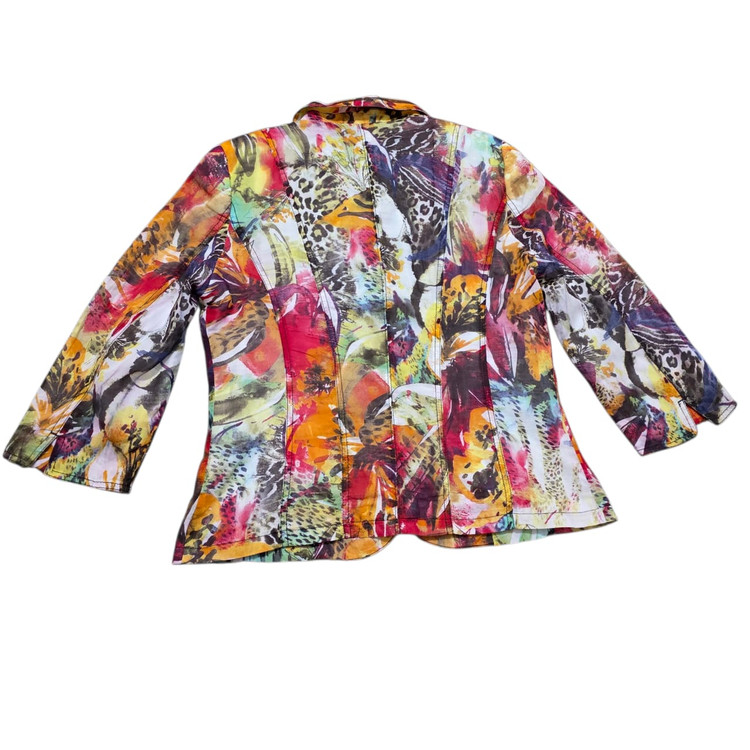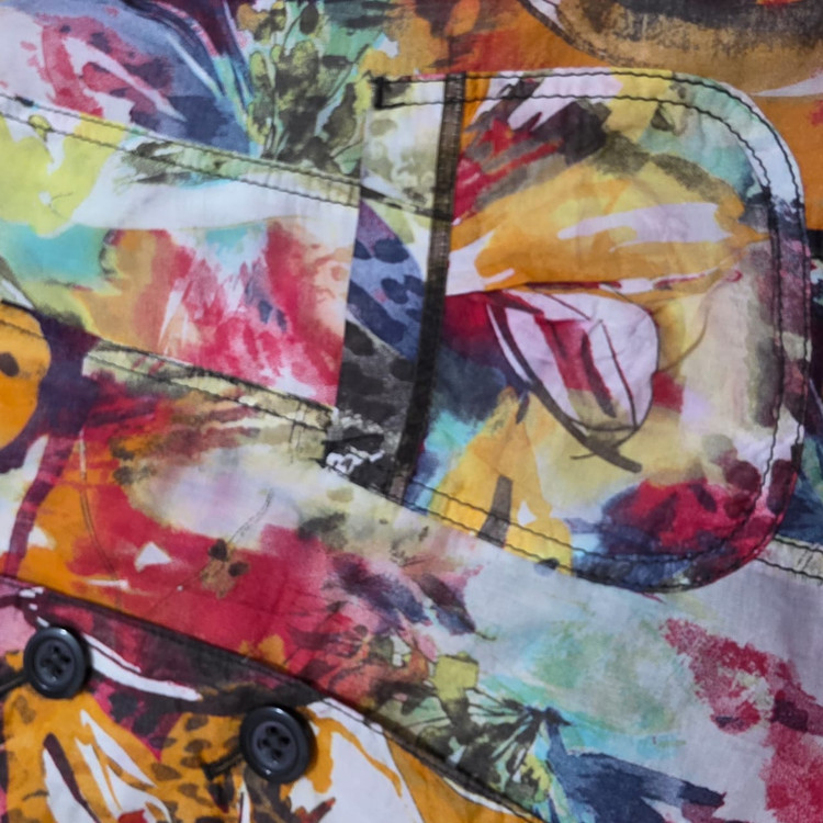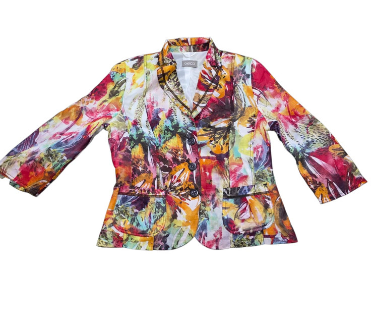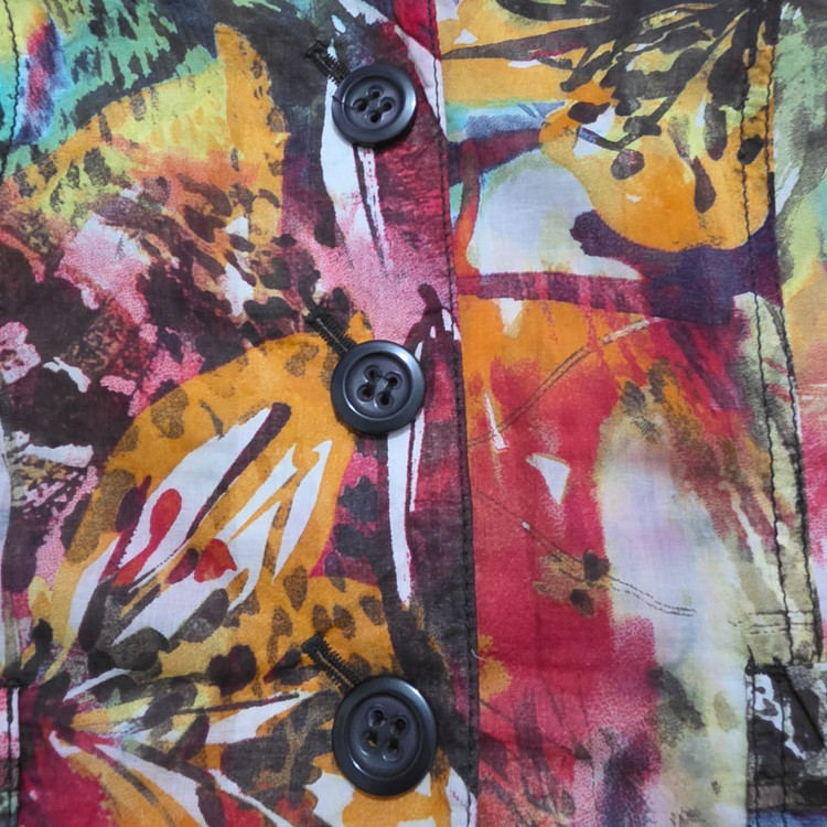این یک کت زنانه با طرحی بسیار شاد و رنگارنگ است. طرح روی آن به صورت آبستره و با الهام از طبیعت (شبیه برگها و گلها) به نظر میرسد و شامل رنگهای گرم و زندهای مانند قرمز، نارنجی، زرد، سبز، آبی و بنفش است. یقهی آن به صورت برگردان است و دو دکمه در جلو برای بستن دارد. همچنین، دو جیب پاکتی در قسمت پایین کت دیده میشود. این کت برای فصلهای بهار و تابستان و برای افرادی که به لباسهای پرانرژی و چشمگیر علاقه دارند، مناسب است.