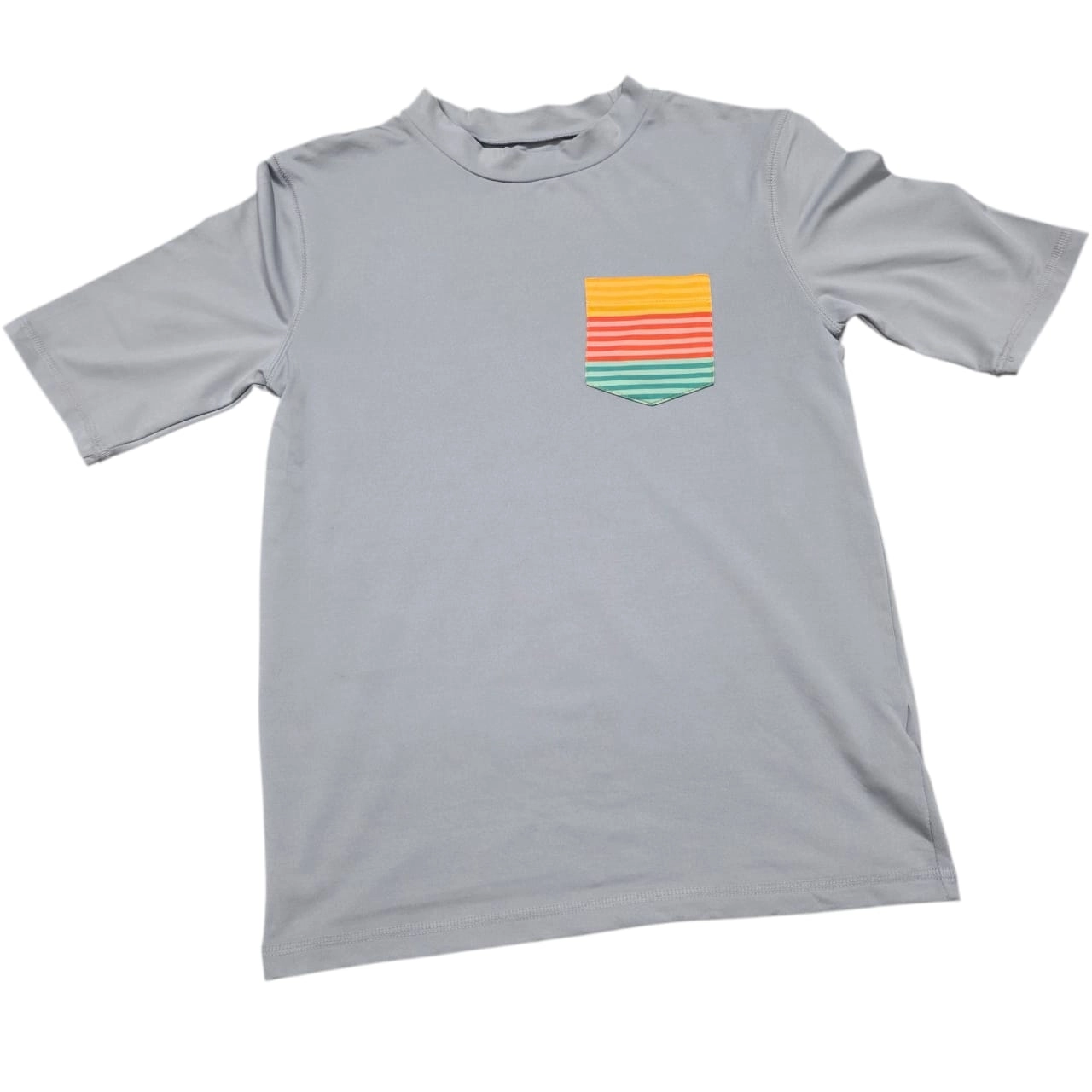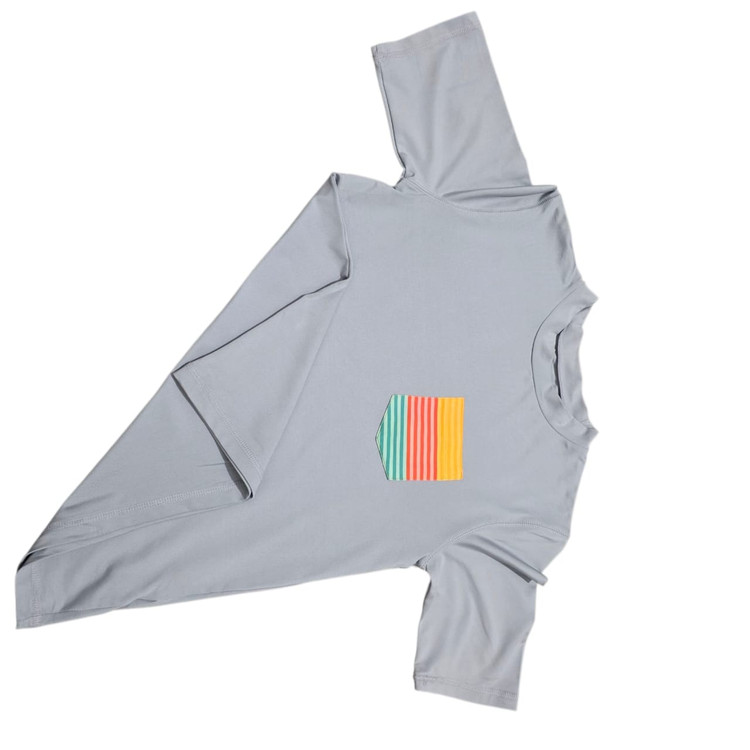 • جیب: طراحی جیب بهصورت راهراه افقی با رنگهای زرد، نارنجی، قرمز، صورتی و سبز است که جلوهای شاد و متفاوت به تیشرت میدهد.