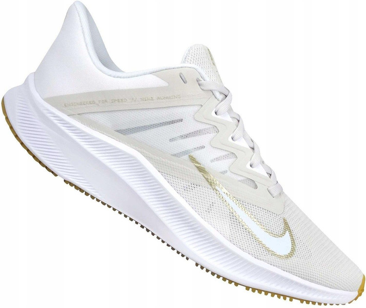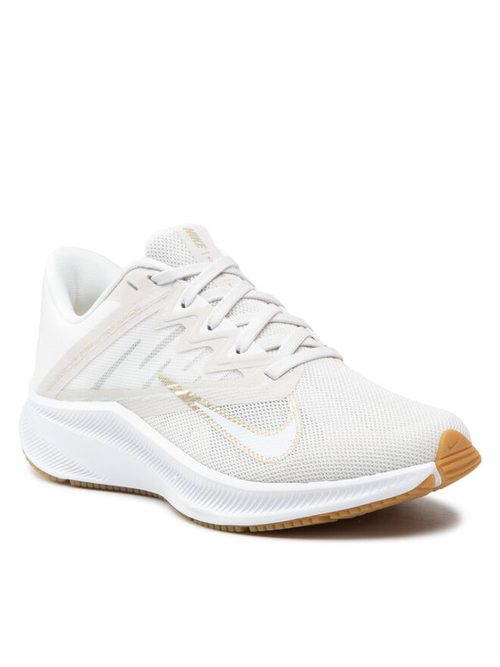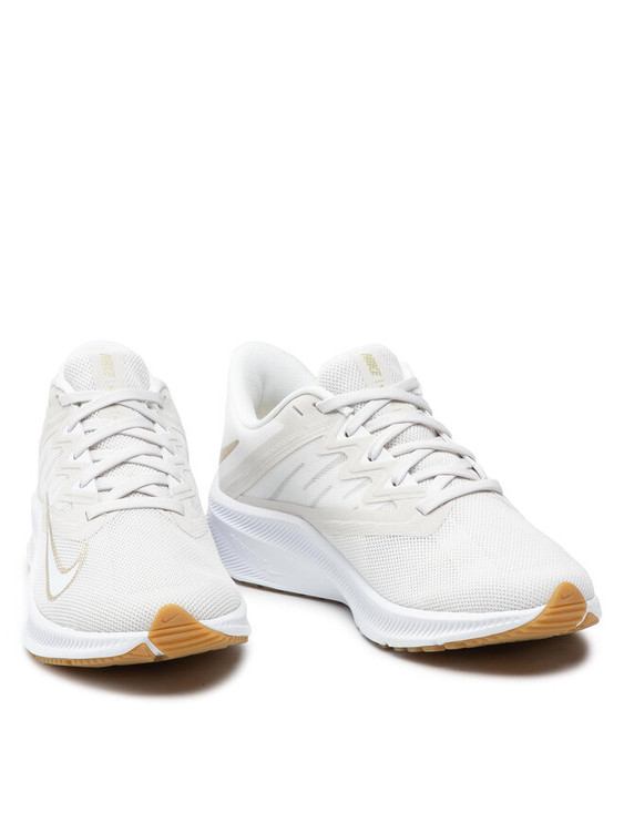 این کفش مدل Nike Quest 4 (یا نسخهای بسیار نزدیک از سری Quest) است. رنگبندی آن ترکیبی از سفید، استخوانی و جزئیات طلایی با زیره لاستیکی به رنگ قهوهای روشن (Gum Sole) است که ظاهری بسیار شیک و تمیز به آن بخشیده است.