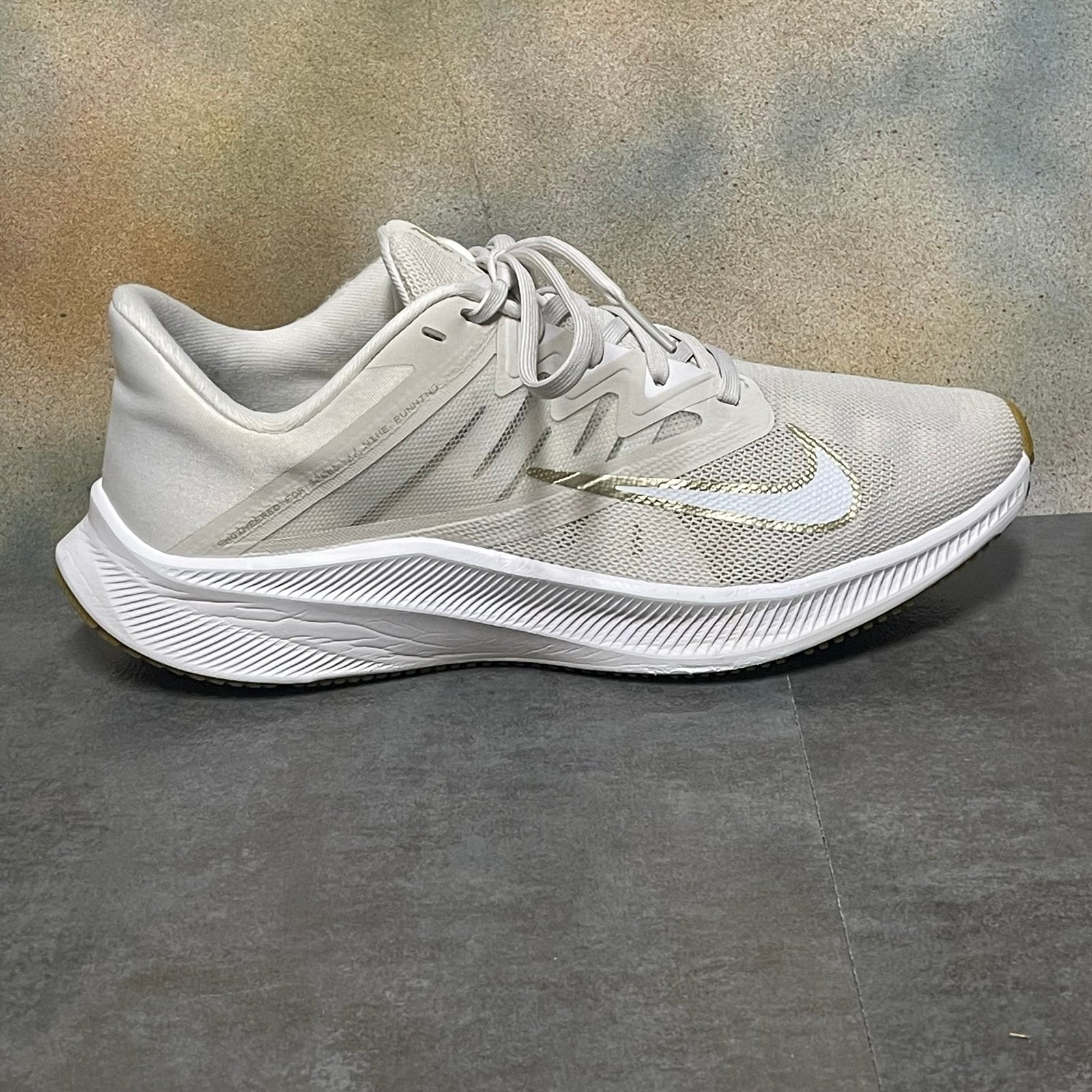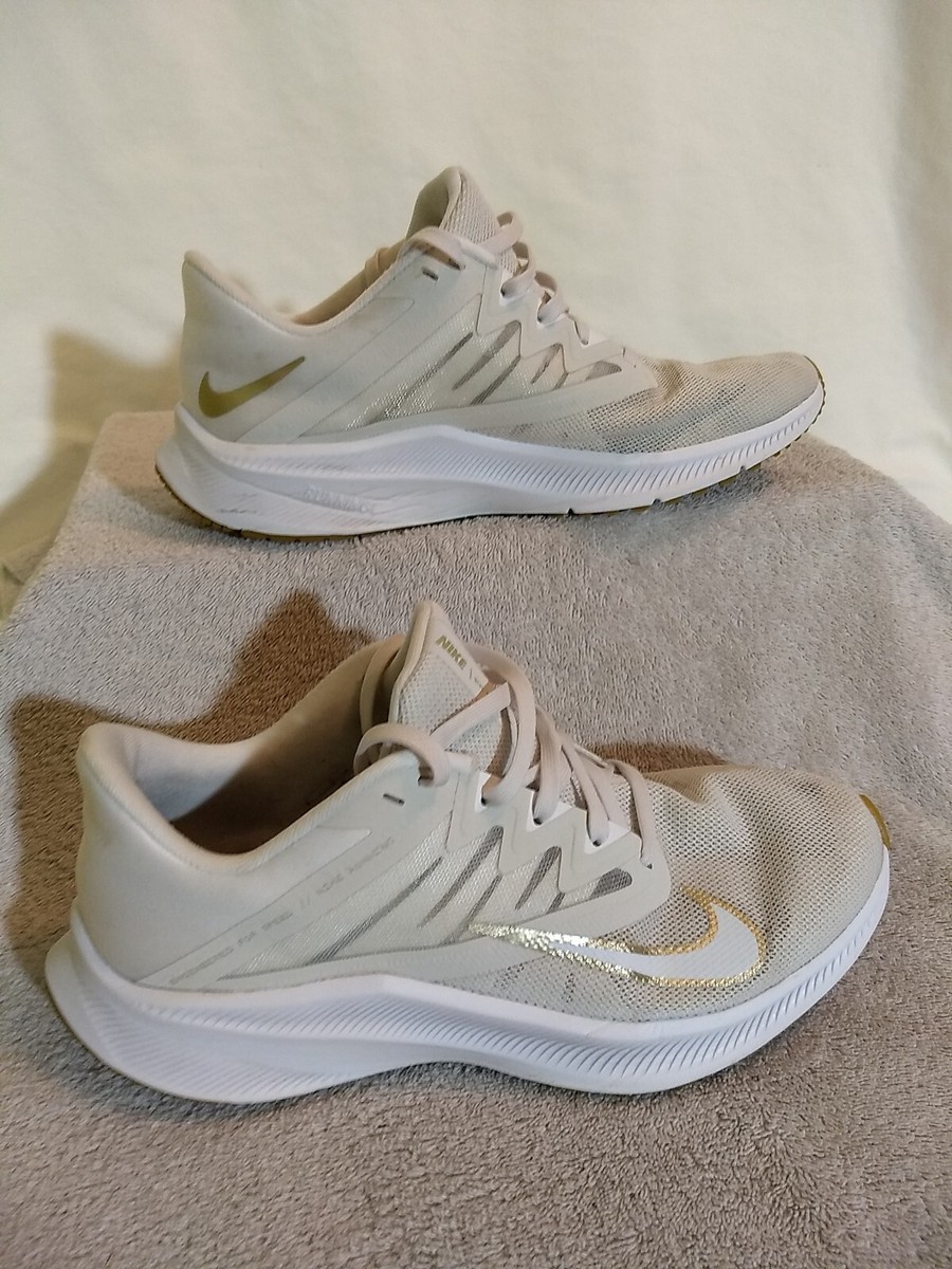 این کفش مدل Nike Quest 4 (یا نسخهای بسیار نزدیک از سری Quest) است. رنگبندی آن ترکیبی از سفید، استخوانی و جزئیات طلایی با زیره لاستیکی به رنگ قهوهای روشن (Gum Sole) است که ظاهری بسیار شیک و تمیز به آن بخشیده است.