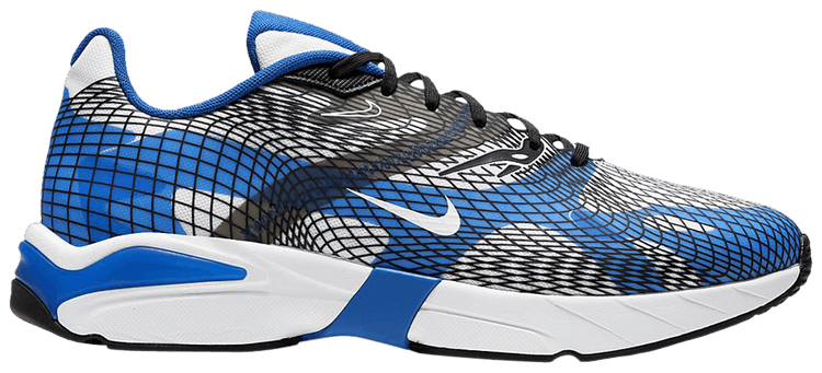 مدل Nike Air Max Alpha Trainer 5 (یا سریهای مشابه Alpha Trainer) است که با یک طرح گرافیکی خاص و رنگبندی آبی، سفید و مشکی طراحی شده است.