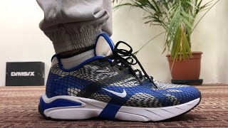 مدل Nike Air Max Alpha Trainer 5 (یا سریهای مشابه Alpha Trainer) است که با یک طرح گرافیکی خاص و رنگبندی آبی، سفید و مشکی طراحی شده است.